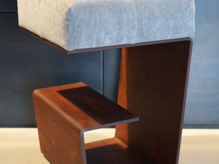 Dieser exklusive Hocker aus Cortenstahl (natürlich gerostet) und verschiedenen Sitzoberflächen bietet dir die etwas andere Sitzgelegenheit!